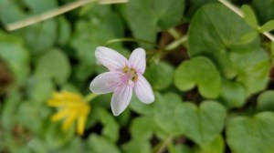 Virginia spring beauty growing up through a patch of invasive cellandine