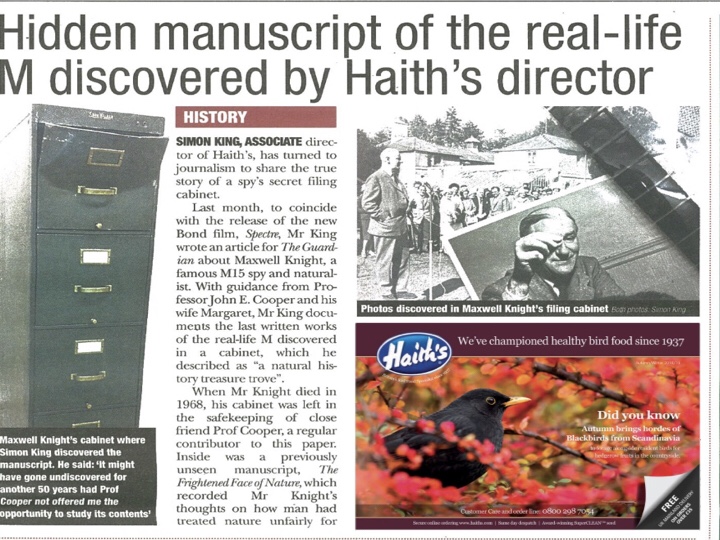 As we heard from John, Maxwell Knight died on Wednesday 27 January 1968 at the age of 68. You could think of him as ‘M’ – Britain’s greatest spymaster. Or, you could picture in your mind an altogether different kind of Knight – an enthusiastic, perhaps eccentric, yet methodical field naturalist who shared his knowledge with avuncular charm at the drop of a deerstalker, a keen ornithologist with an evergreen love for cricket and with such generosity, empathy and humanity (especially for the young). I think that’s the Knight I’ll think of – unless I’m watching a Bond movie on Christmas Day!