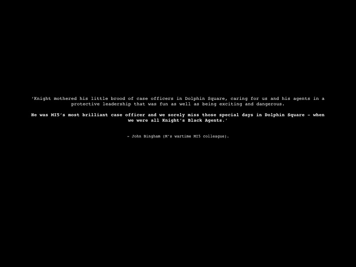 “Knight mothered his little brood of case officers in Dolphin Square, caring for us in a protective leadership that was fun as well as being exciting and dangerous.